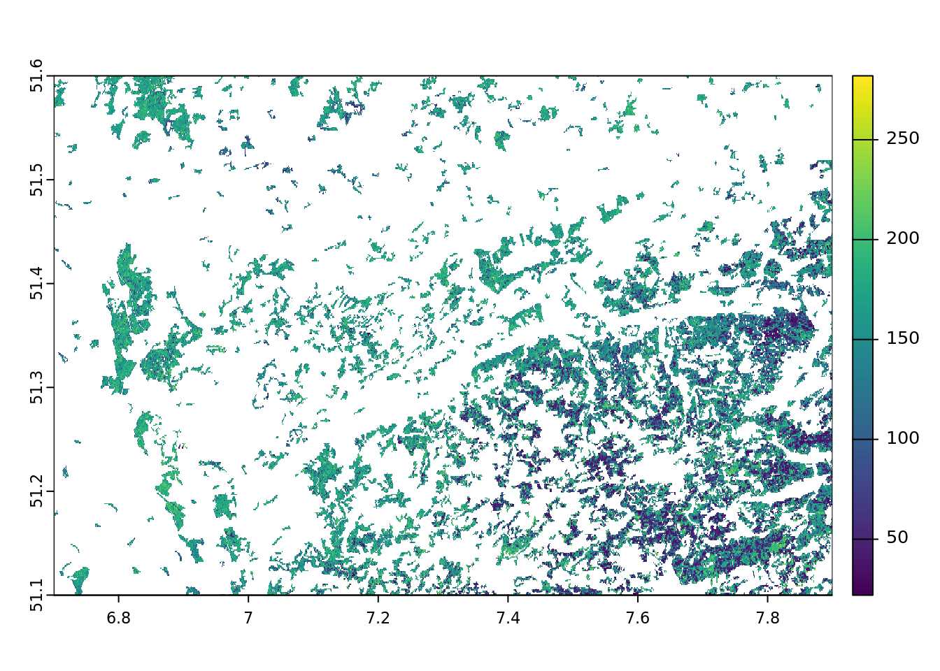 Ein Satz von bioklimatischen Variablen aus dem WorldClim Modell. Dieser Datensatz wurde mit dem Paket geodata heruntergeladen und auf die Umgebung von Bochum zugeschnitten.